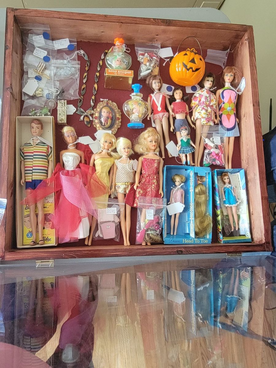 Bag sale has some exceptions! Vintage Liddle Kiddle Kologne dolls in their bottles, Crumpet Doll, Dancerina Doll, Baby Go Bye Bye doll with Buggy, Pocketbook Dolls, Paper Dolls. Colorform sets, Board Games, Tyco 440 pit row Slot car race track with slot cars, plus a few other toys. Antique Davis Dental Crown display box. 2 Coors light metal signs. Bundy Alto Saxaphone. Some Glassware and glass serving pieces, vintage Jeanette glass pink bows and buttons pattern, vintage punch bowl, a couple sets of China dishes, alot of plastic tupperware containers and plastic party trays. Double electric Crockpot server, vintage meat...