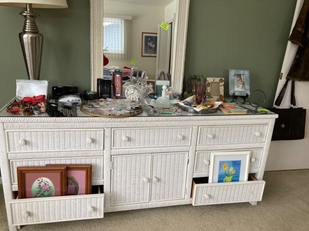 January 18 & 19, This sale offers two full floors, a large covered patio and a 2 car garage - all offering items you’ll enjoy: Henry Link wicker furniture, 2 sofas (one mid-cent), glass coffee & side tables, antique round oak table w/4 modern chairs, antique dresser with mirror, antique oval library table, antique George Washington andirons, nice queen bed(complete), 2 twin beds, lots of nice bedding (sheets, blankets, comforters, etc.), costume jewelry, Paul Welch painting, many lamps, LOTS of kitchenware, cherry items, many small appliances, small sideboard cabinet, rugs, washer & dryer, 3 TVs + console, office items (incl....