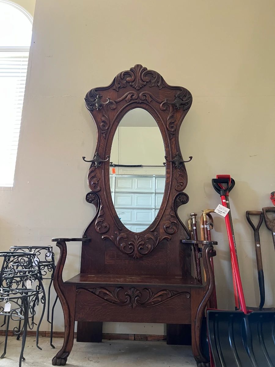 Furniture : antique hall tree bench, antique rotating book side table, wooden benches, sette with matching chair, queen size brass finishing bed, five-piece dark wood queen size bedroom set, Lay-Z-Boy recliner, very large sectional with sleeper, coffee tables, end tables, four dining tables with chairs, large tapestry, barstools, desks, table lamps, floor lamps, wood rocking chair, and wooden TV stands. Household Items : lots of new-in-the-box kitchen items - cast irons, dutch ovens, coffee makers. Plates, knives, blenders, pots and pans, BBQ pans, utensils, etc. Office : Roll-top desk, small office desk, office chair, storage bins, shelving, luggage, office supplies,...