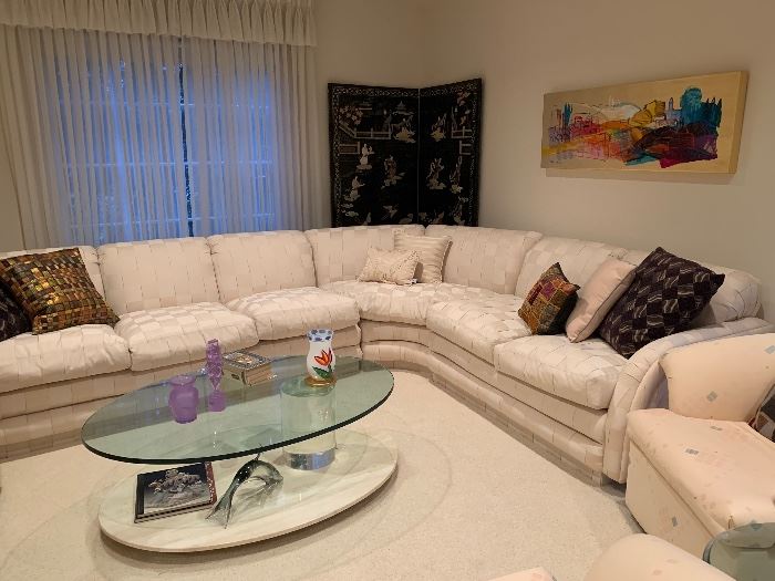 WONDERFUL PACKED ESTATE SALE FULL OF MID CENTURY FURNITURE, FINE ART AND ACCESSORIES FROM A LIFETIME OF COLLECTING! UP TO 50% OFF SUNDAY! FURNITURE INCLUDES: CLASSIC GALLERY SOFA, 3 SELIG SIDE CHAIRS, GLASS, MARBLE, COCKTAIL TABLE, GLASS AND BRASS SIDE TABLES, TRAVERTINE COFFEE TABLE, PREVIEW MID CENTURY SOFA, LEATHER RECLINER, 2 R-WAY MID CENTURY BEDROOM SETS, R-WAY CUSTOM DINING ROOM SET WITH CONSOLE, MID CENTURY SERVER/BUFFET, CARSON GLEN BEDROOM SET, ART AND ACCESSORIES INCLUDE: ROUGIER MID CENTURY LAMP, HUGE COLLECTION OF LLADRO (60+), HEREND, ORREFORS, KOSTA BODA, MURONO, CRYSTAL, NAMBE, TIFFANY, ROSENTHAL, GOEBEL, AND MORE!, SILVER, JUDAICA,, HAND MADE RUGS,...