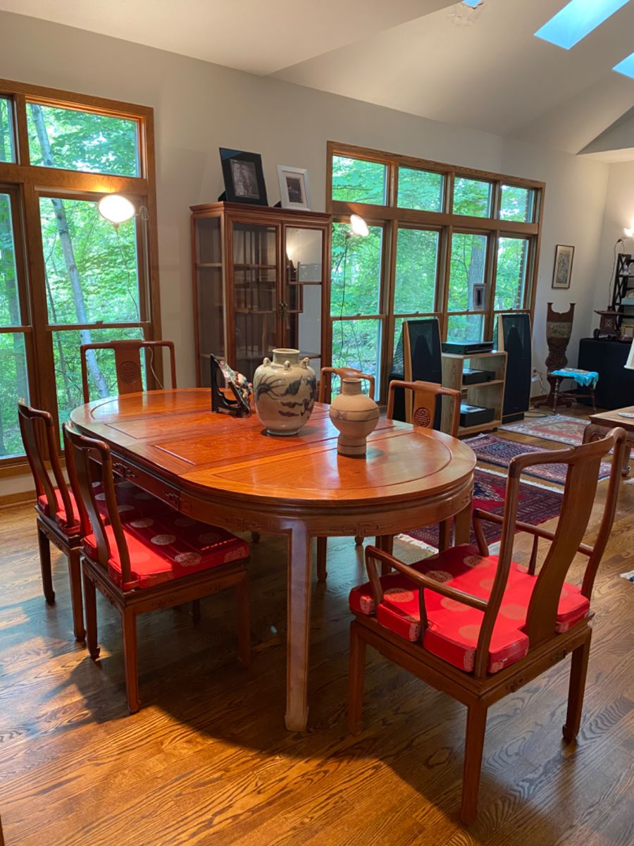 Friday 10 to 3 Saturday 10 to 4 Sunday 10 to 3 Danish Modern includes: Vintage carved Rosewood dining room table 8 Roswood dining chairs Roswood display cabinet Teak wall system Roswood king size bed Teak dressers Asian nightstands 4 vintage barstools Antique carved side chair Elephant table Pair carved Roswood end tables Leather sofa Sofa tables Club chairs Coffee tables Tussle Woodard table and six chairs grapevine Woodard table and two chairs Woodard glider and nest tables Vintage table and floor lamps Loveseat Sofas and armchairs Butcher block kitchen island Buffet and vintage folding chairs Teak entertainment center Several...