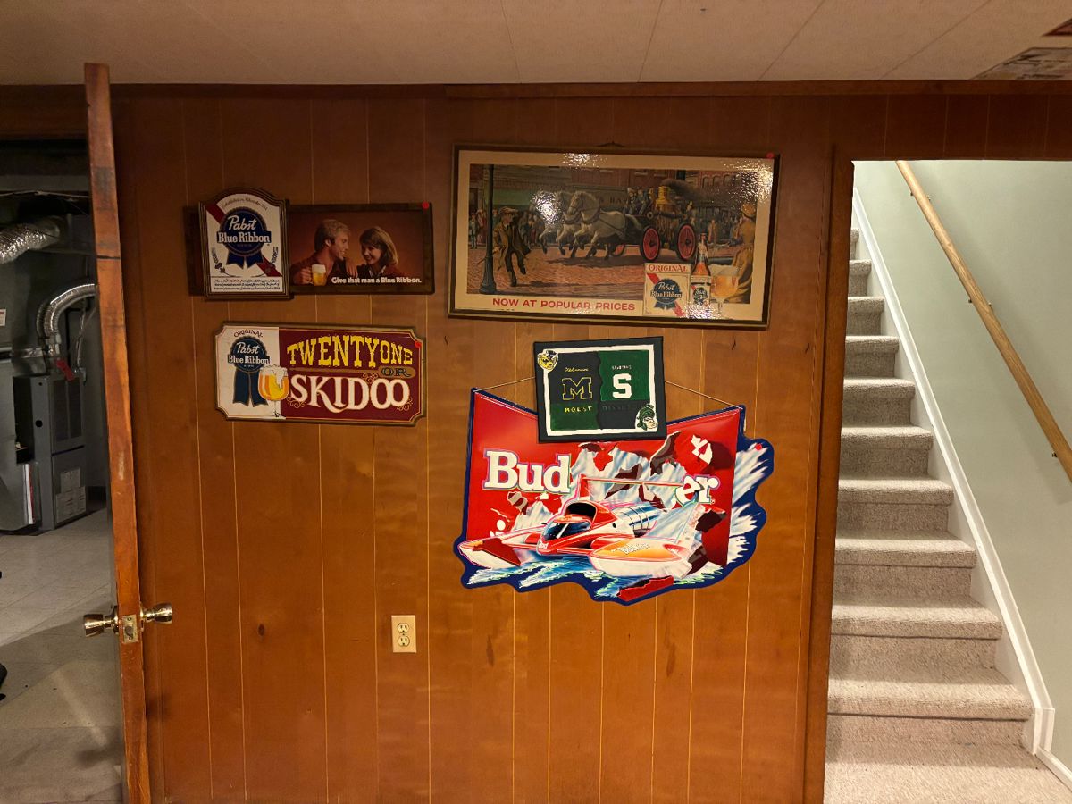 Vintage beer signs and steins and miscellaneous home decor. Woman’s clothing, shoes Chair. Loveseat