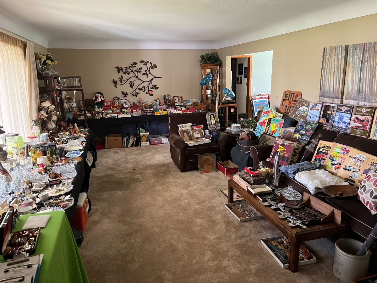 PACKED PACKED Sale to offer the following and much more - Glassware, books, flatware, redwing crocks, stoneware, lamps, end tables, coffee table, toys, car banks, collector cars, dish sets, tea cups, oil lanterns, banks, glass sets, precious moments, holiday items, vintage hats, wall art, linens, clothing, kitchen items, juke box, grain belt sign, vintage gumball machine, woodworking tools, tools, antique golf clubs, frames, kids sewing machine toys, car parts, crocks, stoneware jug, bowling pins, oil jars, milk cans, power tools, shop equipment, chain saw, wood working planes, saws, vintage license plates, tool boxes, drill press, workbench, frames, milk cans, ice...