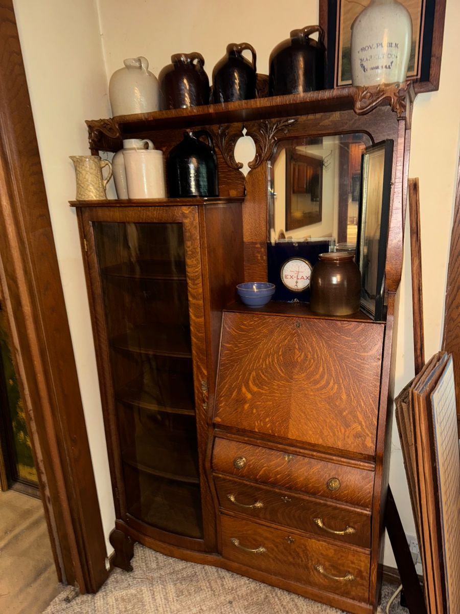 Nice packed sale to including the following and more - 100's & 100's of artwork pieces - including, oil paintings, watercolors, etchings and prints, large stoneware crock collection, Hull pottery, redwing, antique furniture, filing drawers, clothing, linens, frames, beautiful handmade stained glass hanging light, shelving units, books, dressers, Christmas items, paperweights, stands, mixing bowls, stacking bookcase, file cabinets, tonka trucks, toy cars, stoneware lids, jugs, butter churns, wall mirrors, and much much more!