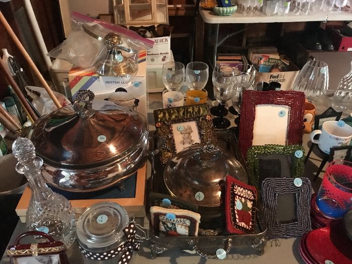 Nice fun sale to include the following and more - glassware, tea cups, plate sets, lift chairs, drinking glasses, kitchen items, sofa, love-seat, HMS Royal Hanover, Echt Cobalt, Winterling Bavaria, coffee cups, hand painted plates, living room chairs, Large drop leaf table, table lamps, modern looking bookcase, vise, metal cabinet, metal shelving, decorating items, Tupperware, health and beauty, modern kitchen table and chairs, flatware set, file cabinets, Christmas items, dressers, lps, wall art, bibles, plastic bins, linens, vintage hair dryer, frames, star wars, hoses, wall art, game table, wicker chairs, games, glassware, lawn and garden items, full garage!, much more!...