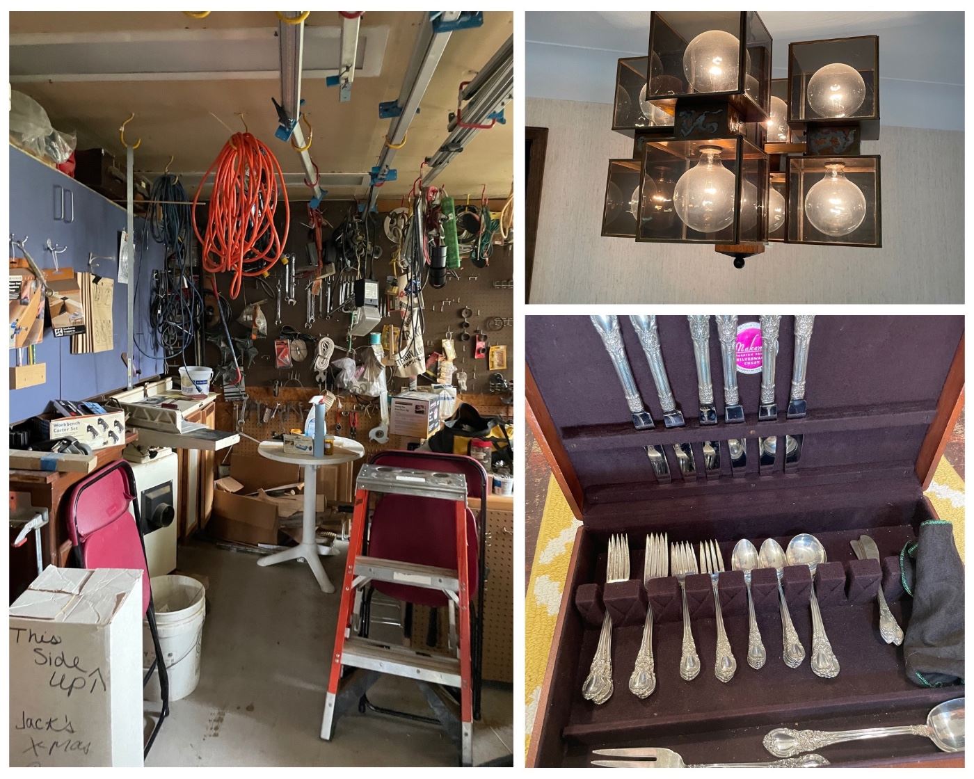 Huge selection of tools including many specialized woodworking items. Great set of matching Mid Century brutalist cube chandeliers and small light fixture. Many furniture items in excellent condition including upholstered chairs, dining room table and chairs, dressers, bookcases, desks and much more. Many great antique and new household items. Set of sterling flatware and jewelry. More photos daily!