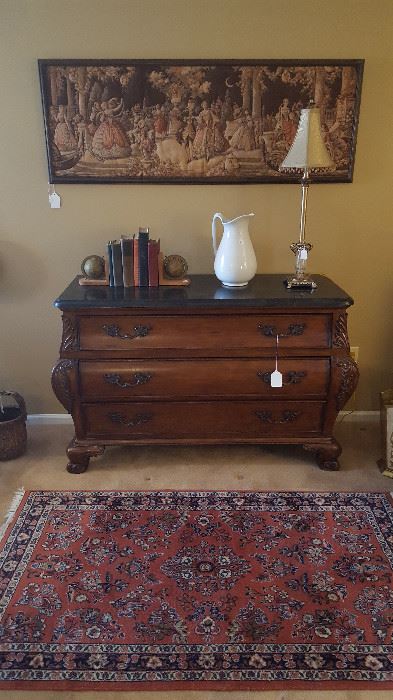 Antique & Other Furniture: Bombay chest w/marble top; game table w/chairs; Empire cherry chest; sofa; off white love seat, chair & ottoman; 2 leather wing back recliners; other recliner; walnut Queen Anne dining table w/6 chairs & 2 leaves; walnut china cupboard; silver chest; tilt top table; pecan bench; pool table; trunks; side chairs; king bed; full bed; iron baby bed; rocker; Lane cedar chest; rattan rocker w/ottoman; school desk; wicker patio furniture; stereo and more. China, Crystal & Miscellaneous: China incl. Royal Worcester “Evasham Vale”, Georgas Briaed “Victorian Garden”; lots white ironstone incl. pitcher & bowl, platters, bowls &...