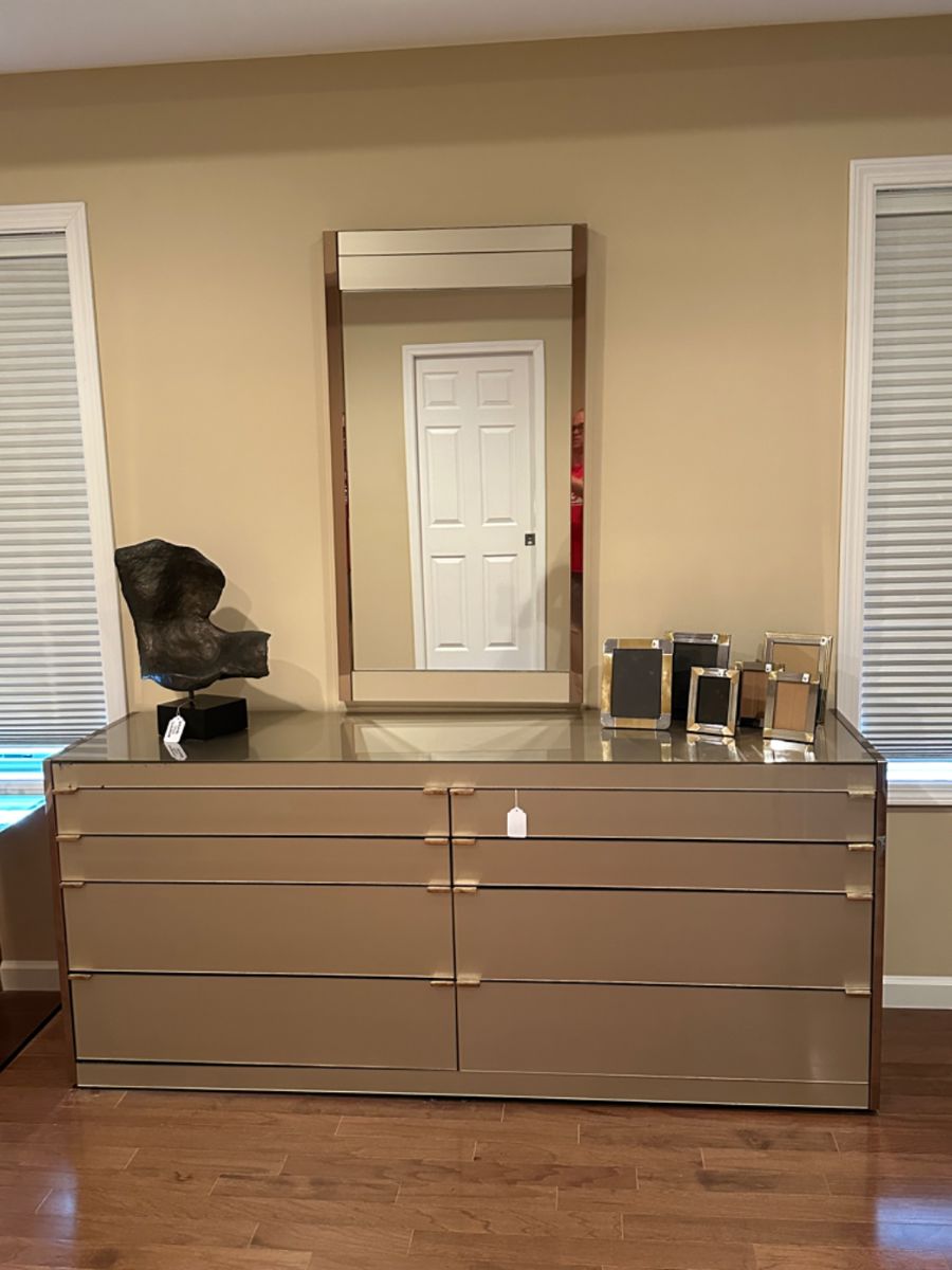Antique & Other Furniture: Ivory glass & mirrored stainless steel 8 drawer dresser & 3 two drawer nightstands by O.B. Solie for Ello; sideboard; dining table w/6 chairs; glass top dining table w/4 chairs; Aldo Tura Italian mid-century bar cabinet; 2 rare Tomlinson end tables; 2 leather top end tables; Beacon Hill Old Colony console table; 2 drawer desk; computer desk; patio table w/2 chairs; 2 patio rockers; patio sofa; patio table w/propane heater; mirrors; vintage wooden twin bed frame; China, Crystal, Silver & Miscellaneous: Lenox Solitaire ; Lenox; Dansk Rondure ; Toscano Noble Excellence; Chinese rose porcelain bowl; vintage...