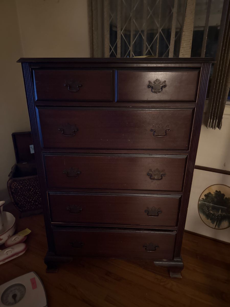 Large items left: kitchen table with 5 chairs, armor, lrg tv stand, end table, dresser
