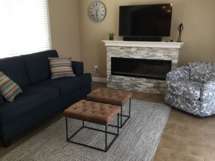 SINGER FEATHERWEIGHT SEWING MACHINE AND CASE, SQUARE BREAKFAST TABLE AND FOUR SQUARE STOOLS, DARK DENIM COUCH, NAVY/CREAM SWIVEL CLUB CHAIR, 42 INCH SAMSUNG SMART T.V., 54 INCH SONY T.V., SEVERAL WALL CLOCKS, LAMPS, AREA RUGS, NEW OAK END TABLES-ONE WITH LEADED GLASS DOOR, 2 SQUARE FOOTSTOOLS WITH LEATHER TOPS, VERY NICE COUCH IN BROWNS AND GOLDS, MODERN OBLONG DINING TABLE WITH 4 CHAIRS, T.V. SOUND BAR, VERY SMALL WALNUT DROP FRONT DESK—WALNUT??, SMALL OAK SERVER—NEW, 3 HANDMADE QUILTS, QUEEN SIZE BED SET. COMPLETE, MID CENTURY CHEST AND DRESSER, MENS X-LARGE CLOTHES AND SIZE 12 SHOES, SHEETS AND PILLOWS, CHRISTMAS ITEMS,...