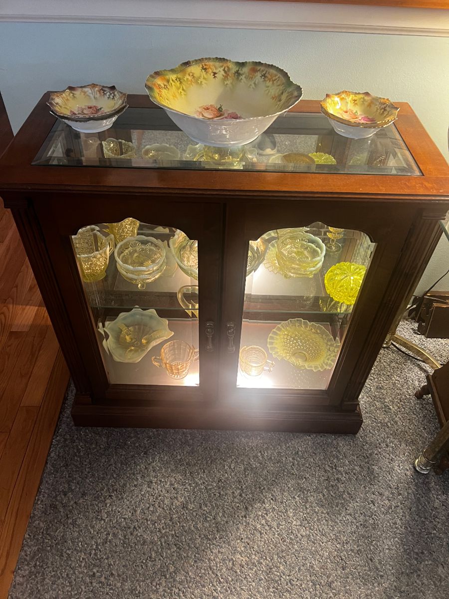 GREAT VINTAGE & ANTIQUE & MCM SALE! Antique Vaseline Daisy & Button Krannert Antique Northwood Vaseline glass Uranium Glass Fenton Vaseline glass Faberge Odessa crystal colored shot glasses Fenton coin dot glass Antique Fenton cranberry sugar shaker Vintage ruby small pitcher Vintage Fenton cranberry thumbprint glass Bohemian glass cobalt blue Hobnail Fenton glass blue opalescent daisy Vintage brown betty teapot Josef original musical flag girl Steuben crystal Coin spot glass Mosser glass Depression glassware Royale Stratford teapot MCM Broyhill Saga Queen headboard/footboard and Highboy chest Antique Ewer Mckee pressed cut glass RS Prussia serving bowl & salad bowls China cabinet...