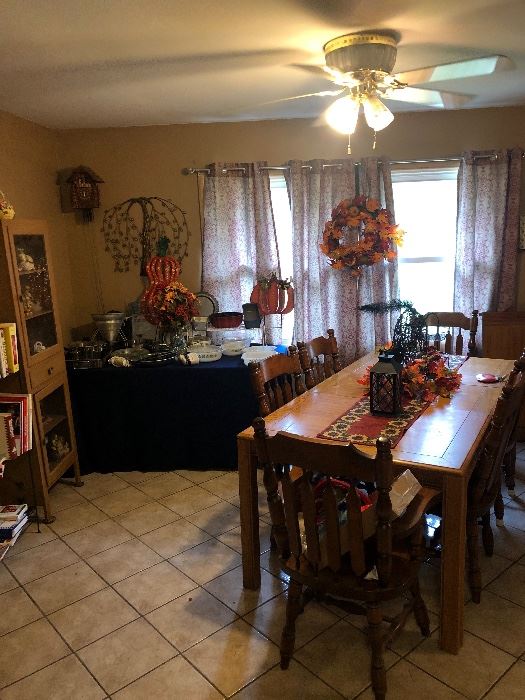 Table and chairs, bar server, in tables, curio cabinet, china cabinet, TV stand, dresser, wing back chairs, Headboard, office chair, antique trunk, cedar chest, brothers sewing machine, pictures, kitchen wares, dishes, pots and pans, toaster oven’s, ninja coffee pot, ninja chopper, microwave, fall Decour, Christmas deco, quilts, linens , patio set, craftsman push mower, Tools, yard tools,, outdoor bench,, Tonka toys, fishing poles, tackle boxes, tiller, much much more