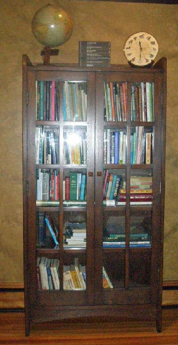 Lots of wonderful Arts & Crafts (mission) antiques., Settle with carved motif and cut outs (attributed to Phoenix Chair Co. and David Kendall), Center table with leather top and tacks, Mission Buffet, China Cabinet and Server, Globe stacking barrister bookcases (2), W.H. Gunlocke rocker, 5 W.H. Gunlocke dining room side chairs, Mission 54" round oak table with 5 leaves (Tagged Lifetime #9081), Roll top desk, Pottery: Roseville Mostique and Columbine; VanBriggle; Zanesville, Number frames wood engraving prints including Thomas Nast Christmas (1860 - 1865) and Remington, Mission tri-fold mirror, Porch Swing (attributed to L.&J.G. Stickley or J.M. Young), 6 piece...