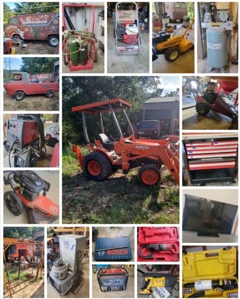 Kubota tractor/backhoe, Scooby truck, tools, furniture, household, and appliances. Did I mention tools?