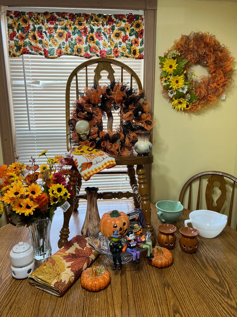 Holiday-Christmas, snowmen, fall. Chrsitmas trees Partylite Hess die cast Corelle, pampered chef Loadlocks Heavy duty straps & bungees Pine king Bed & furniture Jewelry chest Dining table with 4 chairs Salon items including rolling cart Reclining coach Recliner Pot and pans, baking pans, utensils Lamps, Home decor, frames Craft supplies Two pegboard easels for craft displays Cummins fuel/water separators Motorcycle helmets including Harley CB Radios & antenna Cat tree Small appliances Outdoor holiday lights Coolers Yard spreader