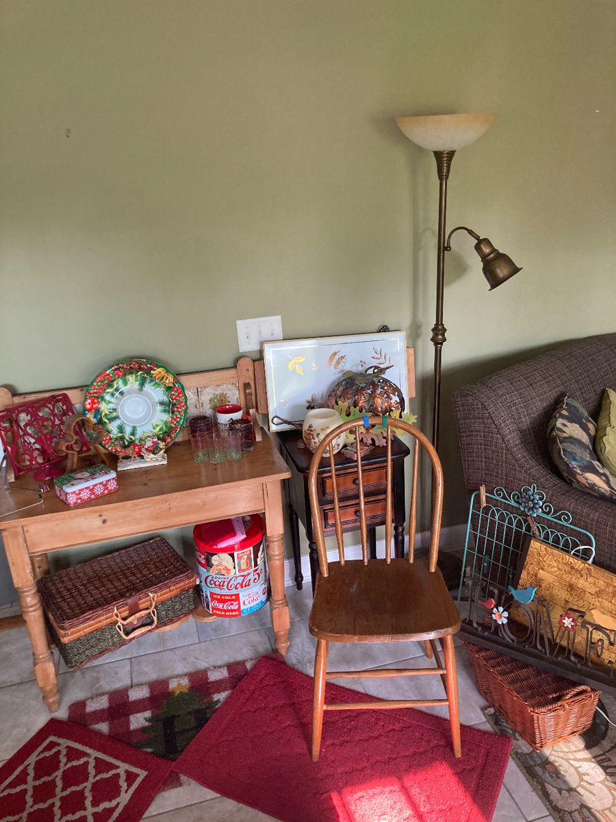 Desks, bedroom furniture, couch, dining table & chairs, linens, golf and sports, medical equipt, grill, chiminea, patio table and chairs, office supplies, books, childrens toys and books, camping and outdoor equipt, baking, dishes, cook books, small appliances, cleaning products, home decor, lamps, records, DVD, CD, TV, stereo equipt.