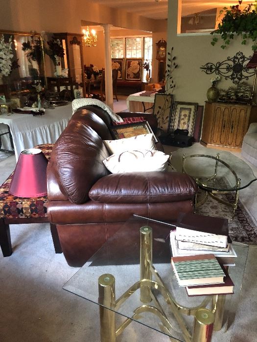leather sofa, recliner, tables, pictures , home decor, lamps, dining table and chairs, china hutch, dishes, bar stools, kitchen items, clothing, too much to list!!