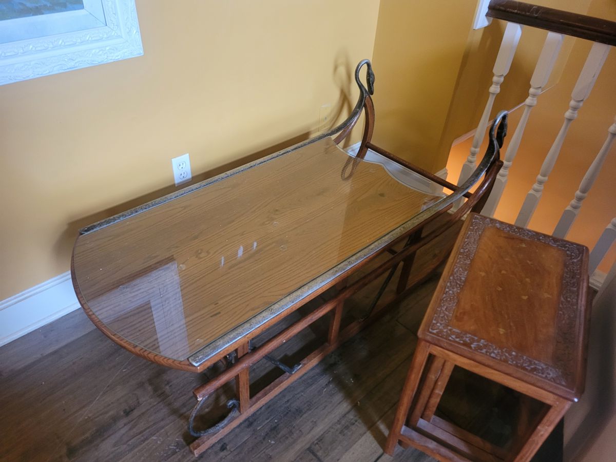 Tell City swan wood, metal and glass sleigh table, Various tables and chairs, Electric fireplace, Luggage, Multi colored braided round rug, Vintage trikes, Garden shed, Animal carriers, Pride Mobility Scooter, Dewalt DW106, Makita TM 3010C, Metal bench, Crosley record player, Dvds/cds, 4 poster bed, dresser, nightstand, Waterford 12" Balmoral vase and Waterford lamp, Paper weights, Rugs, Lamps, Wicker/glass top furniture, Mirrors, Ornately carved sofa, chair and Ottoman with tapestry fabric, Folding chairs, Charbroil grill, Parametric style slatted lounge chairs, Air Compressors, Patio umbrellas, Vintage metal banner weather vane, Ladders, Fenton art glass blue Hobnail, 2 Wicker chairs with cushions, 4...