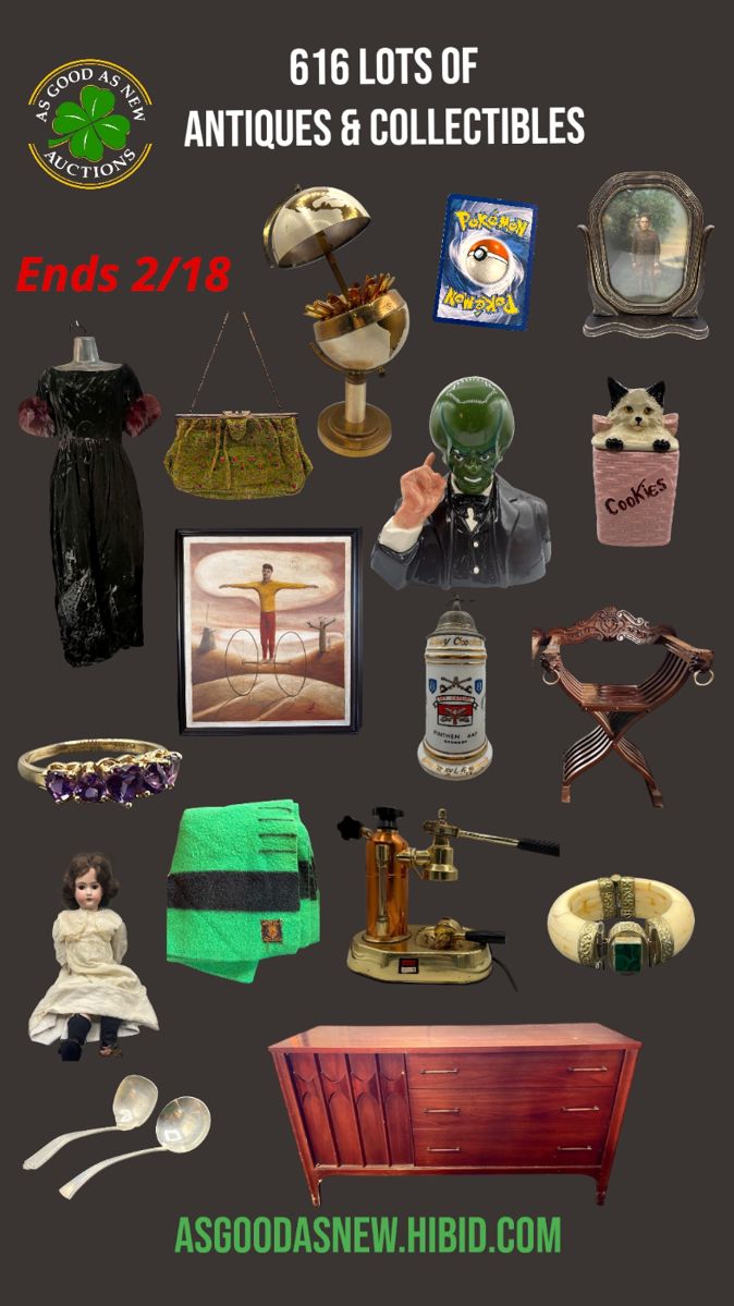 Auction begins to close Wednesday February 18th @ 6:30 616 lots of Antique & Vintage Collectibles including: Antique and vintage jewelry including gold, silver and costume. Many lots of sterling silver scrap, flatware and more. Sports, magic the gathering & Pokemon trading cards. Vintage clothing including an Oscar de la Renta boutique velvet and fur dress, many concert and band T-shirts and more. Limited edition Wizard of Oz cookie jars, Waterford Crystal, Pendleton and four point wool blankets. Pocket knives, coins, an antique Tiffany and Company Sterling silver frame purse, artwork, antique dolls. Antique and vintage Furniture, Seeburg trashcan jukebox,...