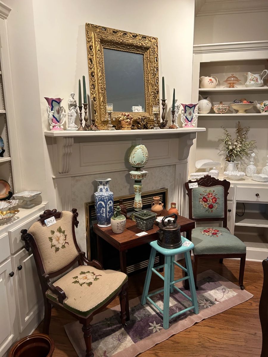 Antique dressers, needlepoint back chairs and china cabinet, buffet, three drawer chest, East Lake square table, secretary, china cabinet, occ. tables, cherry dining table and six chairs, vintage telephone bench and table with four chairs, couch, rockers, round glass top table with two chairs, occ. chairs, display cabinet, office chair, desk, bar stools, cabinet w/ rounded front, washer/dryer, microwave, odd pcs. of furniture, table top sewing machines and sewing notions, plant stands, mirrors, American Fostoria, lg. set of Pfaltzgraff china, two sets of Limoges china, set of Royal Ivory KPM The Symphony and Desert Rose china, kitchen glassware, and appliances,...