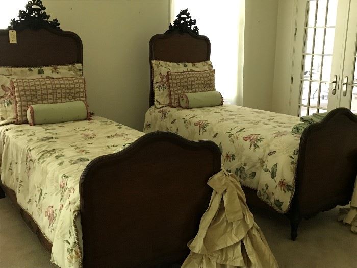 Lovely furniture, artwork and home furnishings! Homeowners have a new home and don’t have a place for these beautiful items. Home furnishings: French day bed, chaise lounge, Jenny Lind canopy bed, matching petite French day beds including matching linens, hall tree, dining table with 4 chairs, baker’s rack, wicker bedroom furniture including twin headboards and mattresses, chest, bedside table and desk, selection of lamps, upholstered chairs, Ethan Allen desk and chairs, storage chest, entertainment center, 2 – 9’ curio cabinets, oriental rugs, 4’ decorative corner shelf, coffee tables, occasional tables, desk, bookcases, mirrors, original artwork, brass firedogs, brass fireplace set,...