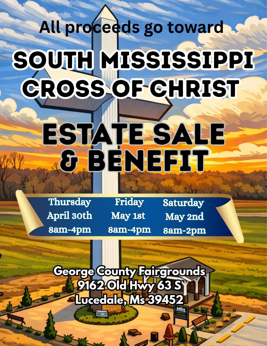 This sale will be held at the George County Fairgrounds building. This sale is a Benefit Estate Sale. 100% of proceeds will go toward building the first 120 foot “Cross of Christ “ in southern Mississippi.