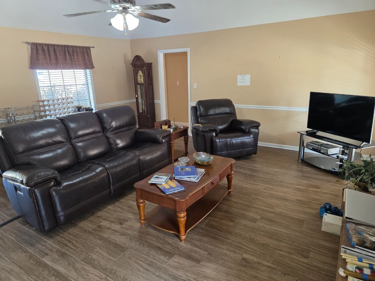 Powered black leather sofa with recliners at both ends Powered black leather rocker which reclines End table and coffee table Formal dining table with chairs Formal buffet/server Three (3) glass front curios with mementoes, glassware, etc Faux plants Tempered glass TV stands Matching twin beds with mattresses Chest of drawers Queen bedroom suite--bed, dresser, chest of drawers, nightstand Full bed frame--headboard, footboard, rails Kitchen table with leaf, 4 chairs and bench Three (3) refrigerators--two Whirlpool, one Kenmore--used Whirlpool stove, new in box Whirlpool over the range microwave, new in box Whirlpool dishwasher, new Storage shelving Lawn and garden equipment Christmas...