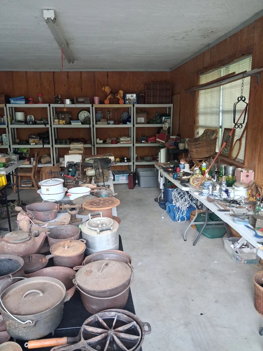 This Sale is loaded with lots of cast iron pieces- skillets, pots, pans- primitive tools, turpentine tools, wagon makers toos, blacksmith tools, antique wooden kegs, antique tools, antique axes, antique hammers, large Antique Mill Stone, Well pulley, lots of antique tools, Lots of Knives- large small new old, ammunition, antique- collectible guns, paintings, old bottles, antique documents, ammunition boxes, ammunition crates, belt buckles, antique lantern, antique enamelware, antique train sets, antique kitchenware, antique & collectible blue & white china, stoneware jugs, antique phones, radios, working antique table top fans, pair of arge working gun safes, primitive chairs, yard tools, lawn...