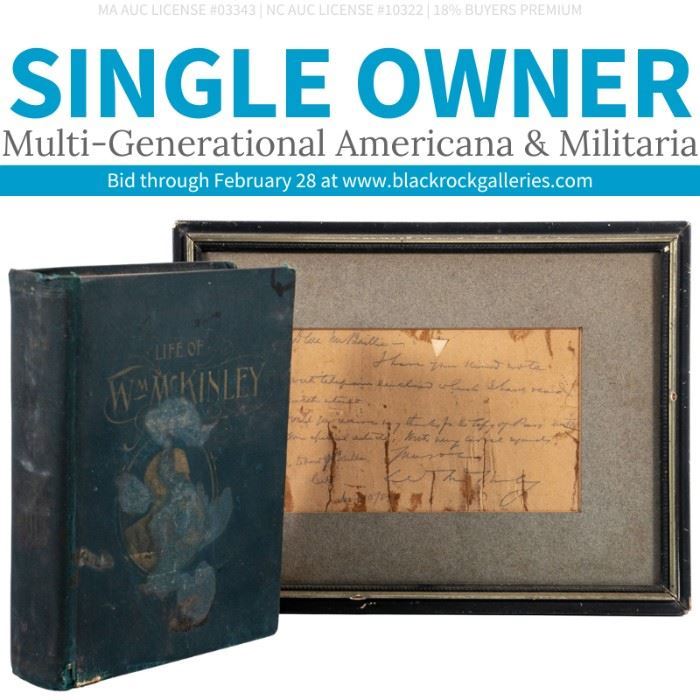 SINGLE OWNER MULTI-GENERATIONAL AMERICANA & MILITARIA AUCTION @BRG-APEX SALE BEGINS TO CLOSE TUESDAY, FEBRUARY 28 AT 8:45 PM EST LOCATION: BRG-APEX 204 ITEMS VIEW ALL ITEMS & BID ONLINE AT WWW.BLACKROCKGALLERIES.COM Black Rock Galleries of Apex is pleased to offer a wonderful assortment of important and historic multi-generational treasures from a prominent New England family with political and military ties spanning from the American Civil War and beyond. Happy bidding! VIEW ALL ITEMS & BID ONLINE AT WWW.BLACKROCKGALLERIES.COM *The items in this auction are available for BRG warehouse-to-warehouse transports for easy local pick-up at any BRG location: Bridgeport, Greenwich, Boston,...
