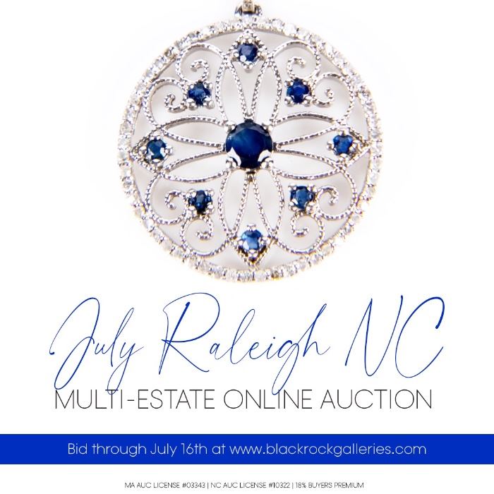 JULY RALEIGH NC MULTI-ESTATE ONLINE AUCTION SALE BEGINS TO CLOSE WEDNESDAY, JULY 16 AT 8:35 PM EST LOCATION: BRG - RALEIGH (CARY) 260 ITEMS VIEW ALL ITEMS & BID ONLINE AT WWW.BLACKROCKGALLERIES.COM BRG is pleased to offer this great, fun sale loaded with treasures from North Carolina and all over the East Coast. So take a peek at the catalog and bid on your favorite lots including: Jewelry ● Antiques ● Rugs ● Art ● Furniture ● Silver ● Coins ● and More! All bids begin at $1 with no reserves. Happy bidding! VIEW ALL ITEMS & BID ONLINE AT...