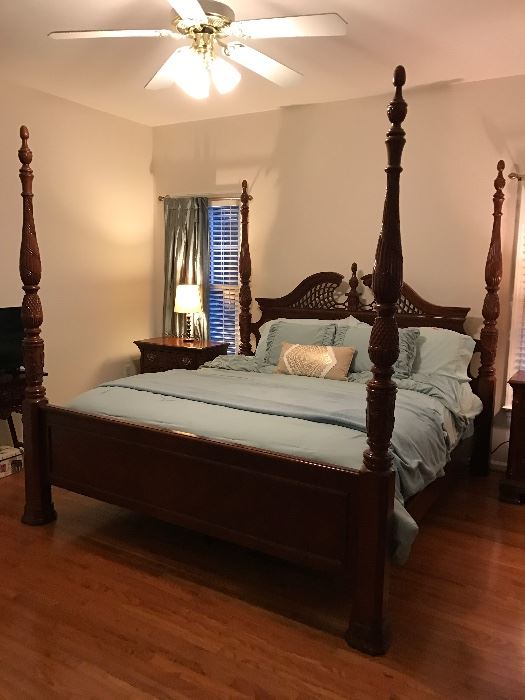 Two sales in one weekend, same Meadowmont neighborhood in Chapel Hill. Carved lignum vitae wood sculpture from Jamaica Leather sofa Leather reclining love seat Four poster king bed, matching highboy, dresser with attached mirror, pair of nightstands Framed art (some original) Blown glass Flatscreen TV Jewelry Whirlpool refrigerator Modern glass / metal desk Comic books Magic the Gathering cards Baseball cards Vintage dresser Desk Swivel office chair Chest of drawers Lamps Framed wall mirror Chiminea Porch rockers Kitchen table with four windsor style chairs Weber charcoal grill Patio furniture Washer and dryer Coffee table Bombacy side table Kitchen items Jewish...
