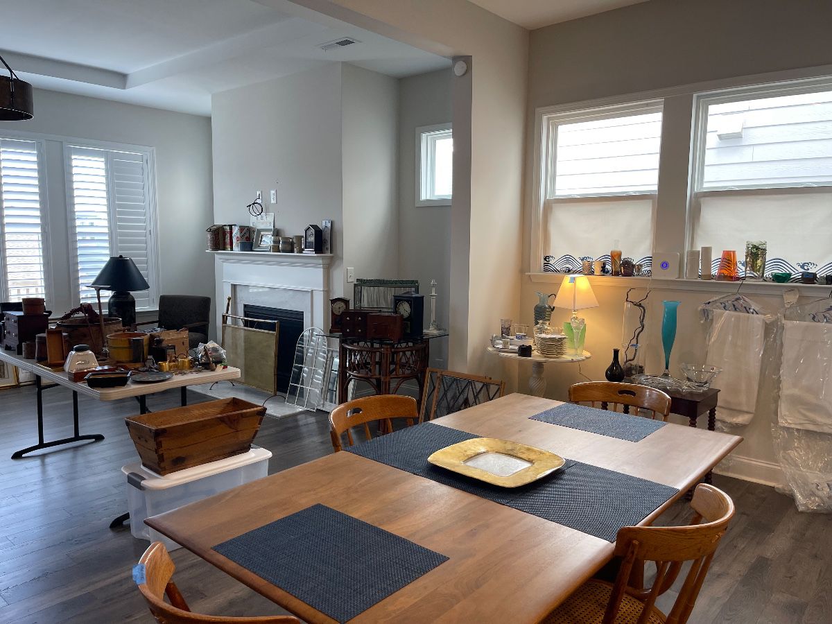 We have lots of antiques, chairs, dining table, side tables, dishes, outdoor furniture, King size bed frame and side tables, women’s clothes (size L-XXL) many new w/tags. Brands included are Chico’s, St. John’s, and more.
