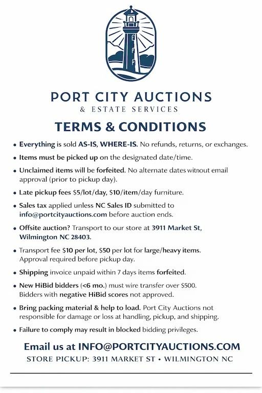 Online Estate Sale – Coastal Furnishings, Art, Tools & More Running now through Sunday, December 28th with a soft close @ 6pm. This online-only estate sale features a curated mix of coastal-inspired antiques, artwork, fine furnishings, decorative accents, and household goods, along with select garage and workshop items. Highlights include art glass, stained glass, rugs, furniture, nautical décor, collectibles, kitchenware, and practical estate tools. Pickup info listed in the auction details. For more information and to Register to Bid visit: https://portcityauctions.hibid.com/catalog/703195/online-estate-sale---coastal-furnishings--art--tools-and-more Port City Auctions Chuck Nance NCAF#10329 • NCAL#5557 • NCRE#218972 For questions, email: stacy@portcityauctions.com 910-371-8503