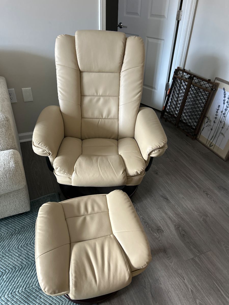 Moving and downsizing.   The more you buy the better the deal!!  2 faux leather recliner chairs with ottomans,   White desk chair, Corner TV stand, off white china cabinet H81 D16 1/2 W55,  pictures, lavendar/green bathroom curtain rugs and towels, Women clothing size 12-14 shoes 9.5.    Bedding,  pillows  seasonal decor and more