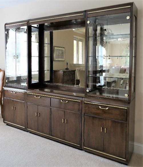 Thomasville Furniture Cabinet - 3 Moveable Sections - Each with Dovetailed Drawers and Doors - Glass Shelved - Mirrored Back - Overall Measures 78" tall 90" by 16" End Sections Measure 24" by 16" Center 42" by 16" Drexel Heritage Asian Style Dining Table and 6 Matching Upholstered Side Chairs - Table Top had Smoked Glass Inserts - Table Measures 29" tall 72" by 42" - All Chairs are Very Clean - Table Has 2 Additional Leaves Measuring 22" Across Ethan Allen Server with Silver Drawer and Fold Out Bar Top - Closed Measures 33" tall 41" by 21" S....