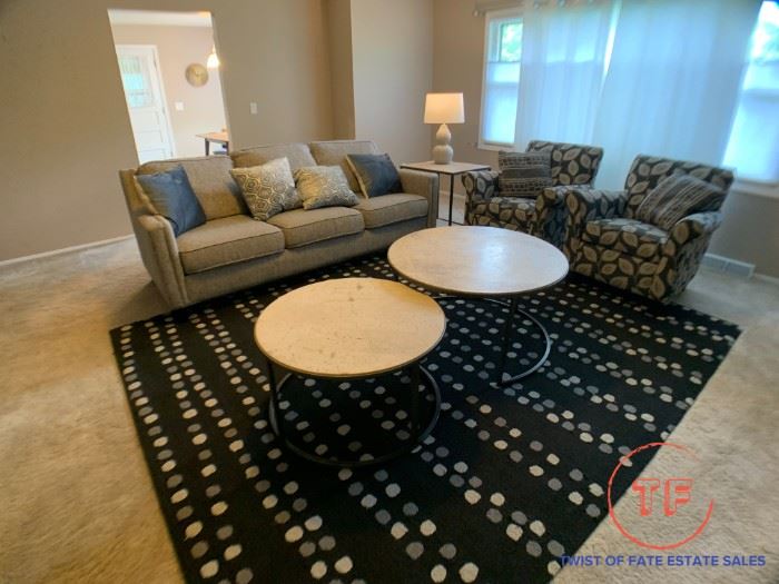 THIS WILL BE AN ONLINE ONLY ESTATE SALE. TO BUY OR BID (ONCE THE SALE STARTS) PLEASE VISIT THE WEBSITE LINK BELOW (You can visit the store now to view the items for sale, but pricing and buying options will not be available until the sale starts): https://twist-of-fate-estate-sales.myshopify.com/ IF YOU DONT ALREADY HAVE AN ACCOUNT PLEASE CLICK HERE TO CREATE YOUR ACCOUNT TODAY: https://twist-of-fate-estate-sales.myshopify.com/account/register IF YOU NEED ASSISTANCE WITH BUYING OR BIDDING, PLEASE CALL, TEXT OR EMAIL US! 402-510-8509 OR twistoffateestatesales@gmail.com FURNITURE: FLEXSTEEL Sofa in Stone Florentine Round Marble Topped NESTING TABLES with Cast Iron Bases ADRIL CHARCOAL Accent /...