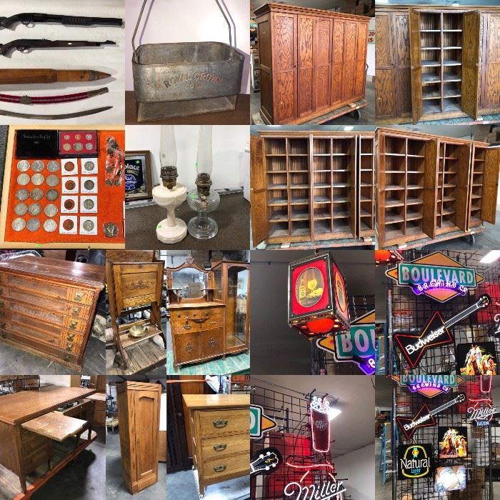 THURSDAY NIGHT AUCTION Thursday March 29th, 5pm at the Auction Mill 1528 N. Saddle Creek Rd Omaha, NE 68104 Rare Furniture, 500+ Indie, Rock, British, Alternative, R&B, Jazz Records from the 1960's to 1990's, Firearms, Antique Oak Furniture, Antiques & Advertising, Silver Dollars, Coins, Aladdin Lamps, Neon Beer Signs, Tools, New Toilets, Sinks, Sand Paper, Gloves, Paint, Saw Blades, Modern Furniture and More Partial Auction Listing: Antique Oak Locker Unit from the University of Nebraska Lincoln Measures: 91" Wide, 74" High, 26" Deep Antique Desk Lamp Marantz Turn Table Model: 6300 Giant Pencil Sharpener w/ Original Box Miller High Life...