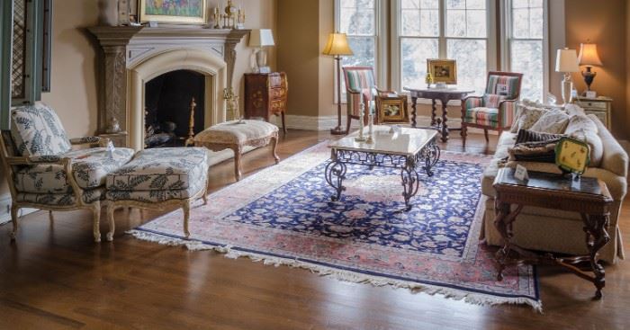 Designer furnishing, art, décor, in elegant Omaha home FURNITURE: custom mahogany round table (converts from 5’ to 7’) with 10 Henredon chairs; L. & J.G. Stickley executive desk & credenza; 4 Baker Furniture Co. chairs; Pearson Co: leather chair & ottoman, custom covered Bergere chair & ottoman, sofa; Baker cocktail table; Kreiss bench; French marble top marquetry cabinet & chest of drawers; ‘Collection Reproductions’ French country round table & 8 chairs; Hickory Chair Co: chest of drawers, chair, ottoman; Chippendale-style mahogany library table; Asian cabinet; Perfit Fils Paris brass & iron baker’s rack; A. Rudin sofa; DUNBAR: wall cabinets, triangle...
