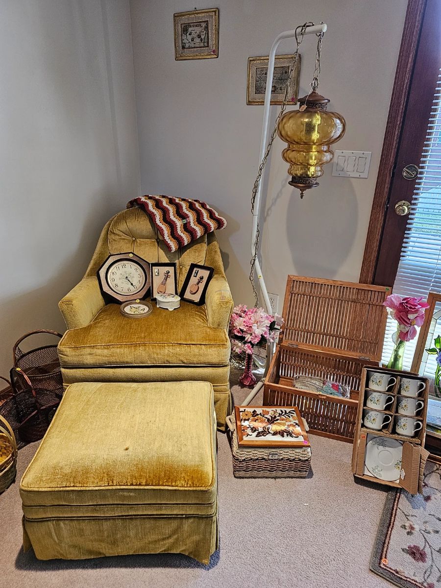 Lots of vintage Pyrex and Corning Ware. Lots of crystal and cut glass tableware for holiday entertaining. Holiday decor, vintage luggage, mid century furniture, project furniture, appliances, like new washer and dryer, electric range and 3 refrigerators. Box of Buick hubcaps. Canning supplies. Clothes, and so much more! everything must go!
