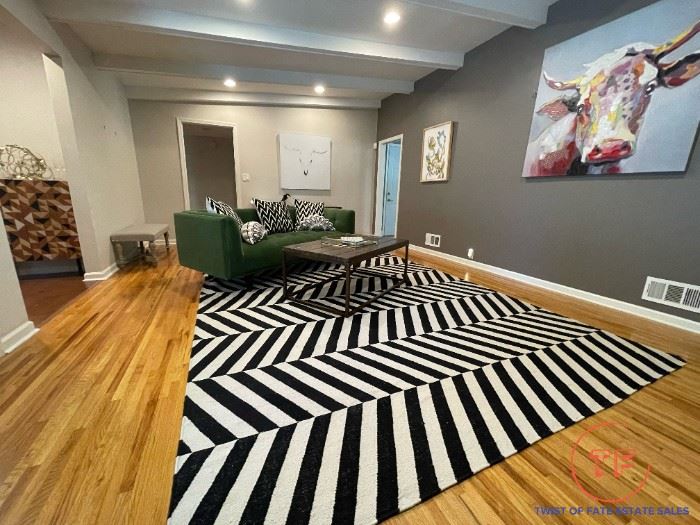 Woodworth Wooden MCM Style Sofa, Distressed Wood Coffee Table, Distressed Wood Sofa / Wall Table, MCM Style Geometrical Pattern Dry Bar / Cabinet, MCM Style Pub Table and Chair Set by Euro Home Living, TOV FURNITURE Regina Bone Inlay Cocktail Table(s), INSPIRED HOME Armchair(s), Large Framed Advertising Posters, Vintage Zenith Radio / Record Player Console, SAFAVIEH Roald Mid-Century Modern Sofa Accent Chair, Sterling Home Decorative Shagreen Side Table in Grey, HICKORY & WHITE 9 Drawer Tallboy Dresser and Queen Size Sleigh Bed, INWOOD Office Furniture Desk, Outdoor Wood Patio Table and Wicker Chair Set, PELOTON Stationary Exercise Bike, Nordictrack T...