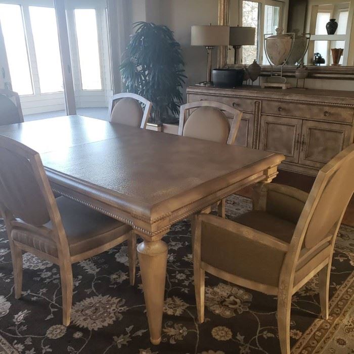 HIDDEN TREASURES Estate Sale This Coming Weekend December 7 -9 th LINDEN ESTATES Beautiful Faux Finish Dining Room Table and Eight Chairs with Matching Sideboard, CENTURY Distressed Leather Sectional, Chair with Ottoman and King Size Bedroom Group, EXPRESSIONS Leather Club Chairs, Occasional and Console Tables, BERNHARDT Marble Top Chest, STANLEY Kidney Shape Desk, EXPRESSIONS Leather Chair and Halves, Large Round Glass Top Table with Six Chairs, Custom Bar Stools, Game Table with Four Chairs, MARIA YEE Chinois Bench, Chinese Temple Free Standing Altar Screen and Carved Window Panels, TUFENKIAN and Many Other Area Rugs, Table and Floor Lamps. MIKASA Golden...