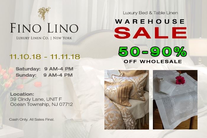 Beacon Hill Estate Sales and Appraisals beaconhillestatesales.com Location: 39 Cindy Lane, Ocean Township, N.J. 07712 Dates: Saturday, November 10 & Sunday, November 11 Times: 9 am – 4 pm Phone: 908-601-5381 Directions: Route 35 South To West Park Avenue Then Make Right Onto Cindy Lane FINO LINO LUXURY BEDDING and FINE LINENS WAREHOUSE SALE!!!! For the First Time Ever Fino Lino is Opening its Doors to the General Public for a Huge Warehouse Sale . We Invite You to Come and take Advantage of the Magnificent Collections at Prices up-to 90% Off Wholesale Prices !! Fino Lino is a 30...
