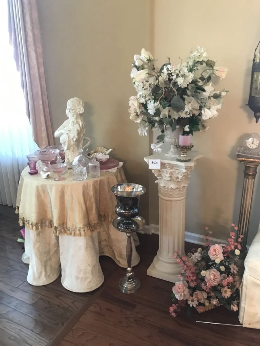 Kitchen ware, full size bed and headboard, many decorative items (many from overseas), couches, sleeper sofa, artificial trees and flower arrangements, 2 entertainment centers, records, bookshelves, vintage antique kitchen table and baker's rack, outside fountain, mirrors, figurines, entertaining glasses and platters and more!