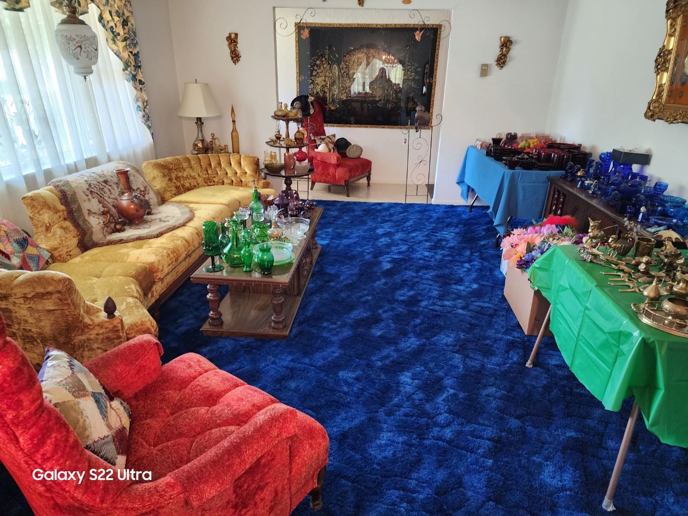 Incredible time capsule home full of collectible glass including antique to vintage…. LE Smith, Blenko, Empoli, Fenton, Viking and more! Mid century furniture and decor, Spanish Mediterranean furniture and decor, rococo style furniture and decor, swag lamps/tension pole lamps and slag glass chandelier and vintage lamps. Large collection of vintage brass animals and decor. Collections of Angel figurines and cherub statues, Greek pottery, and depression glass. Vintage kitchen and bar ware including Pyrex, fine China, Corning ware, vintage flatware sets and several mcm glass sets. Tons of art and mirrors. Great selection of vintage clothing both men’s and women’s, jewelry...