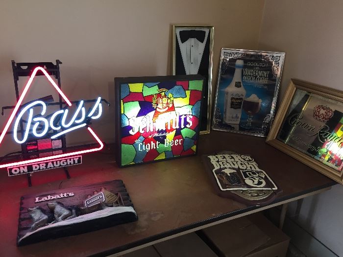 Bareware beer signs. Beer can collection. Kitchen ware. Garden tools.