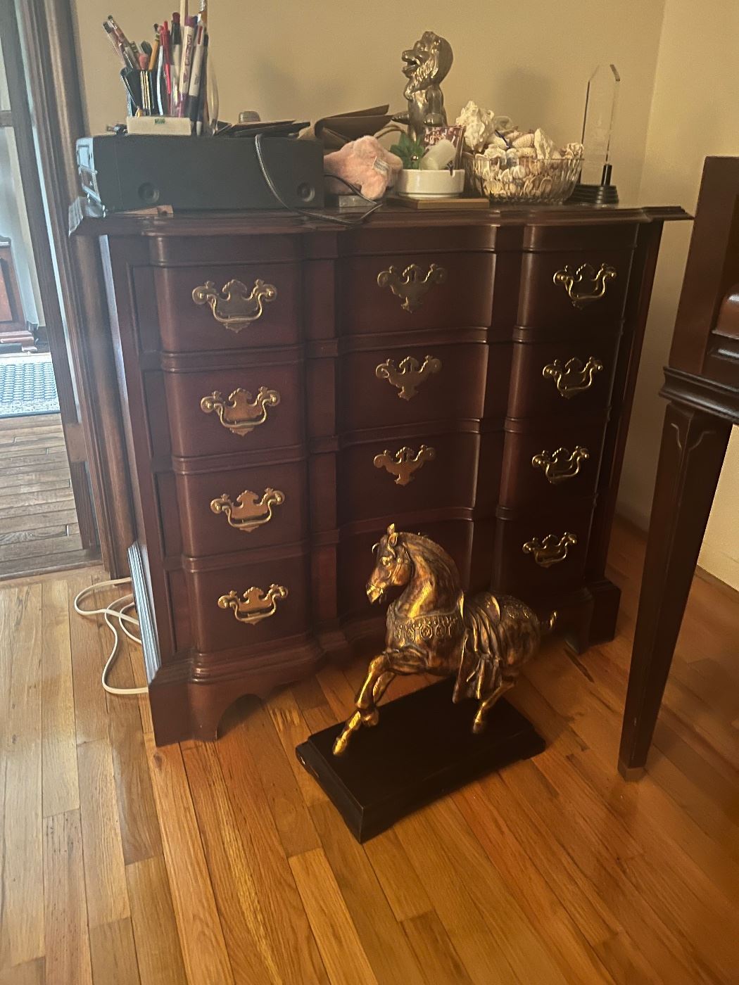 New Jersey Estate and Moving Sales is in Cedar Knolls for a fabulous three day sale.Featured here Is a Baker Historic Charleston Dining room table, chairs and inlaid sideboard, Hickory chest, Councill chest, Waterford chandelier, Waterford Alana stemware, Waterford colored stemware, Waterford 12 days of Christmas stemware, Cashs Crystal stemware and decanter, Orrefors etched decanter, Herend figurine of the princess and the frog, Lladros, Lenox and Bellek, jewelry etc. Sunroom features vintage wrought iron table,chairs, sofa and easy chair, Tole vintage floral chandelier, birdhouse collection, birdcage collection, etc.Living room features a Chickering spinet piano, large bowfront China cabinet, Signed C...