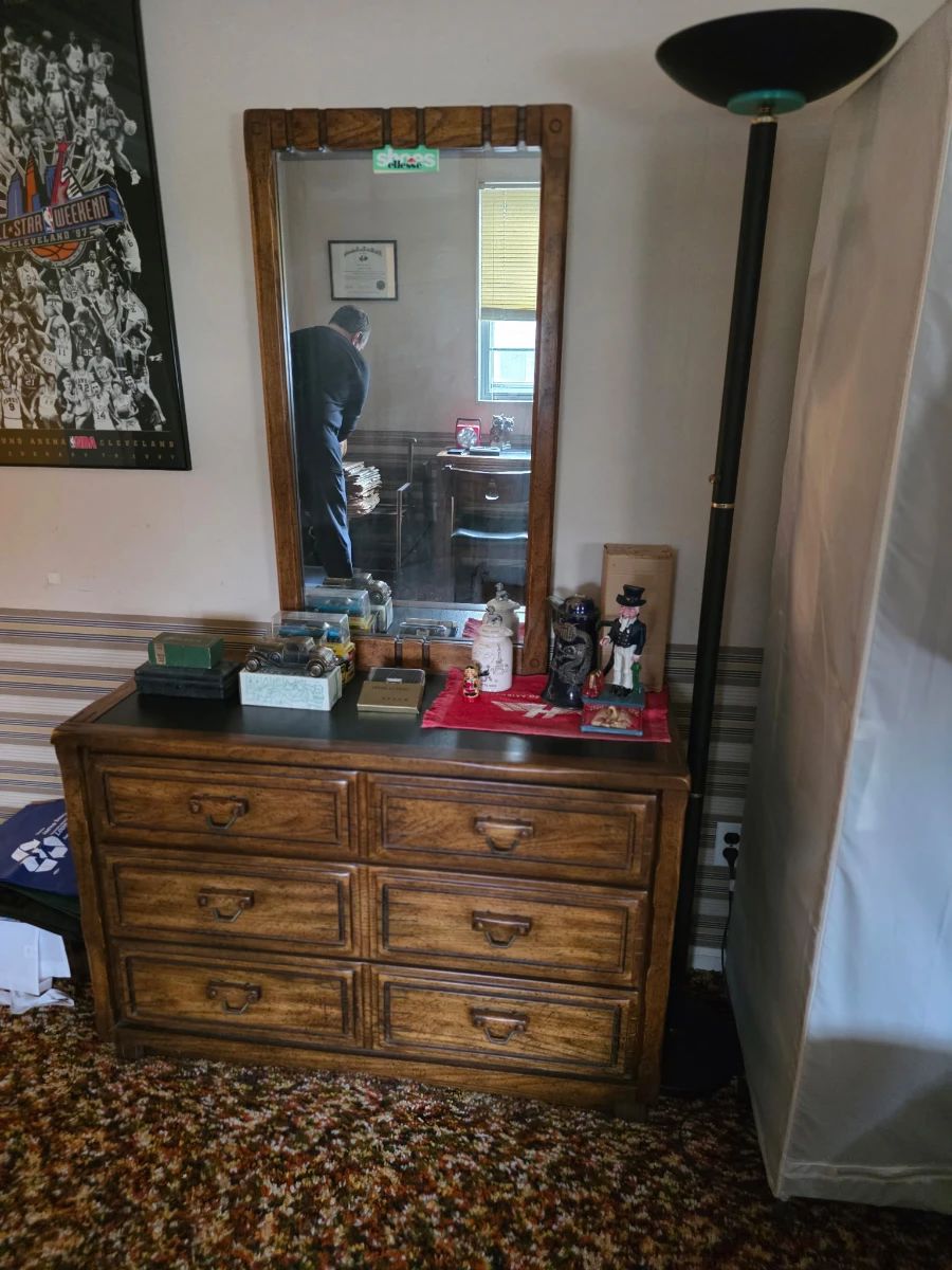 Mid century modern ‘Declaration’ China cabinet by Kipp Stewart and Stewart MacDougall, ladies apparel, vintage clothing, vintage hats and boxes, Chinese style lacquered cabinet with mother of pearl inlay, 80s sports posters, 1997 commemorative NBA All Star poster, lamps, dresser w mirror, old newspapers 60s-80s, desk w chair, vintage bedroom set, 1970 pennants, mid century floor/table lamp, dressers, French provincial style bedroom set, 60s Magnavox console stereo, records, cameras, artwork, physician’s scale, tea cart, wrought iron upholstered vanity bench, bookcase, Shark, Rocket Ultra Light sweeper, 60s Minz transistor tape records IOB, file cabinet, 60s green metal tanker desk, 8’ bar,...