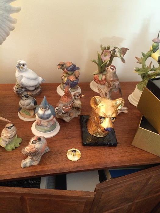 pr. pf chrome base lime green swivel chairs, chocolate brown velvet sofa, white 5-pc. formica DR, white cabinets, dozen of Boehm porcelain birds etc., signed crystal pcs, brass queen bed, mid century B.R. furniture, artwork, collectibles, antique accessories, handbags, linens, kitchenware, books, new leather ladies gloves from Italy, 2 sets of Rosenthal china, loads of nice things you will just adore!