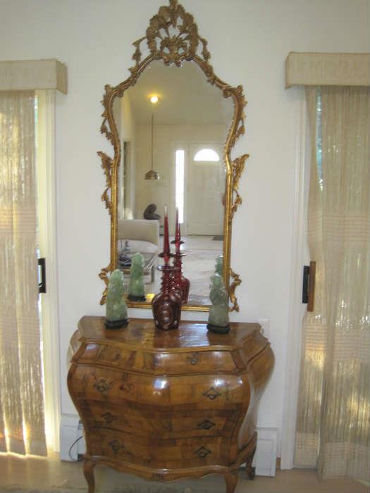 House is packed with quality antique and decorators furniture consisting of a pair of Italian burled bombes, pair of antique French wood gilt mirrors, pair of mahogany carved cane chairs, pair of Italian blonde arm chairs, baby grand mahogany piano, pair of PF Milo Bauman mid century chairs and sofa, chrome mid century end table, multi metal mid century coffee table, five piece inlaid mahogany bedroom set, pair of mahogany three drawer night stands, French sete', Italian hand painted screen, dressers, mirrors, Victorian shelf, mid century black leather chair with ottoman, large carved walnut leather top center hall table, set...