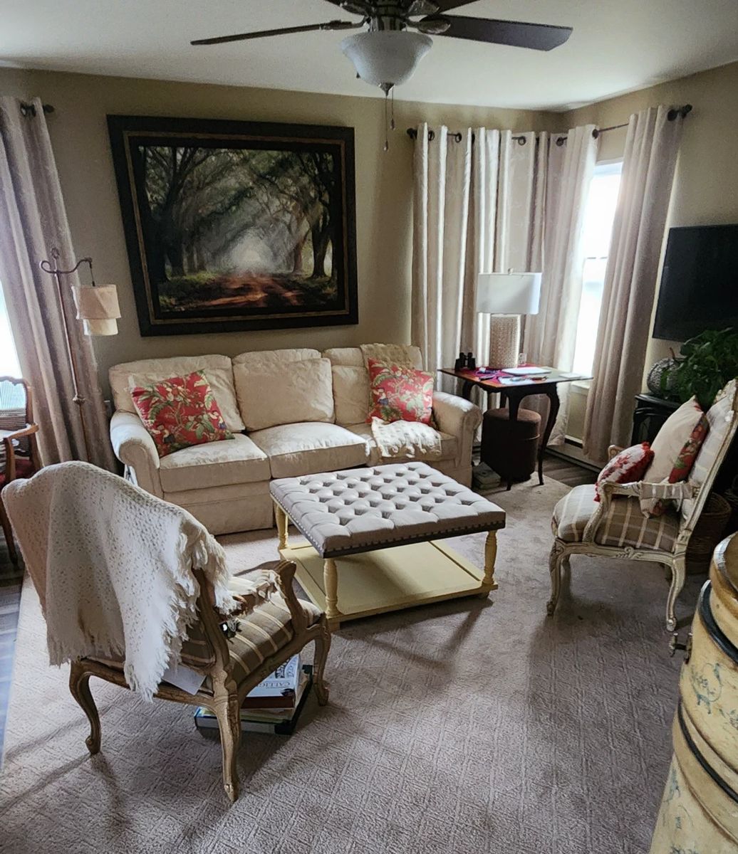 Drexel desk/hutch Bjorn Wiinblad crystal bowl Baldwin bath collection, hardware Century credenza Belleze tufted fabric coffee table Nichols and Stone chair Pilgrim Pine hutch Butler lingerie chest Sherrill CTH 3 drawer dresser Off white damask couch from Brielle Furniture Large wall tapestry by Tapestries Ltd. Fall decorations Christmas decorations Original paintings Lamps Oneida stainess flatware Keurig Waterford Temp-tations, red floral lace Wall to wall carpet cut to fit rooms. Shoes, clothes in good shape Garden tools Most items are very unique, not your average sale.